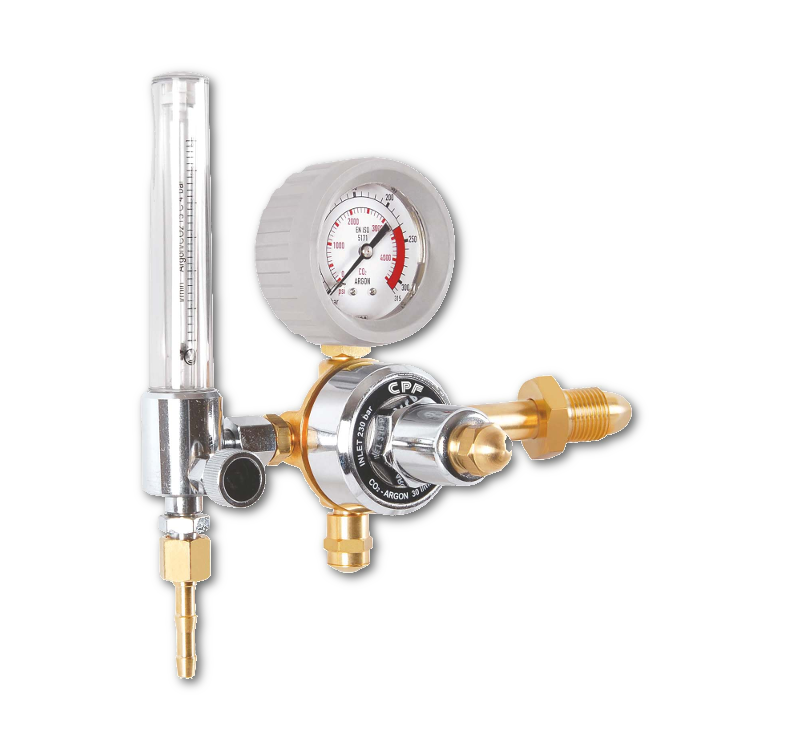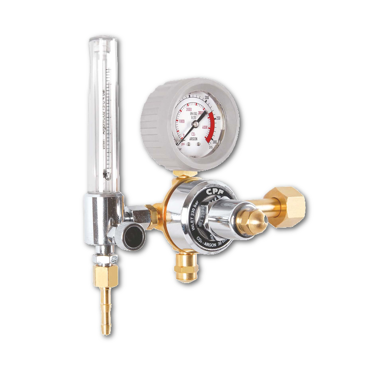 Regulateur simple étage pour Argon et CO2 avec débitmètre en verre haute précision, idéal pour le soudage TIG ou les applications nécessitant un contrôle visuel précis du débit. Le tube transparent avec flotteur permet une lecture immédiate et exacte du débit en litres par minute.