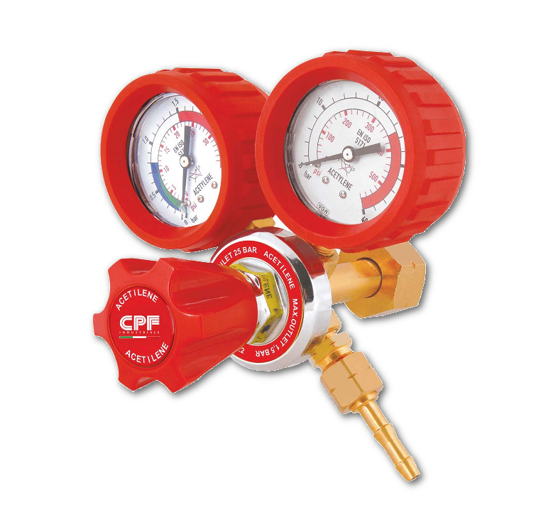 Single-stage acetylene pressure regulator with vertical adjustment knob and rear inlet connection, ideal for welding and cutting. See more...